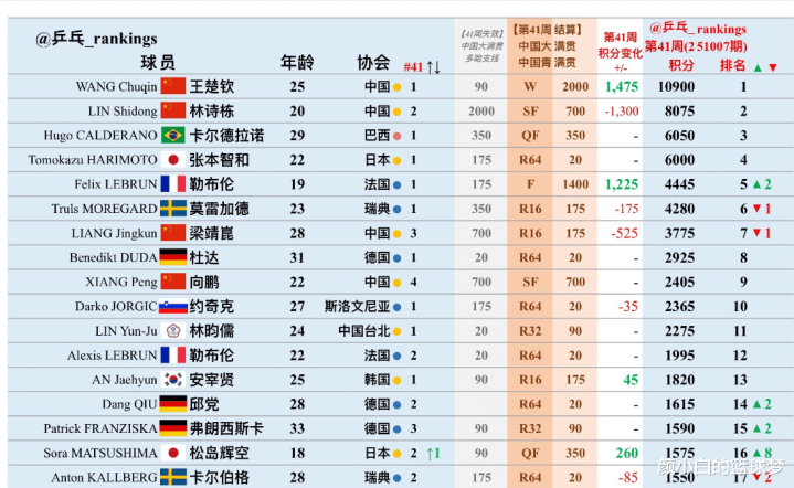 WTT北京大满贯后,王楚钦第41周积分变化+1475,林诗栋-1300,王楚钦积分破万10900分,林诗栋只剩下8075分,王楚钦再度稳居世界第一的宝座。