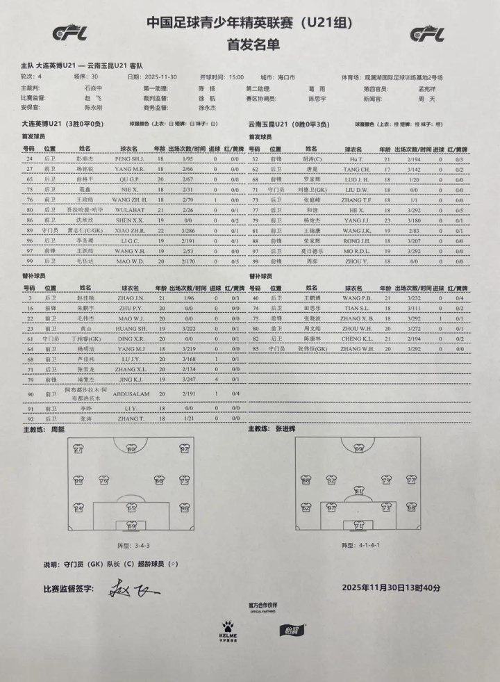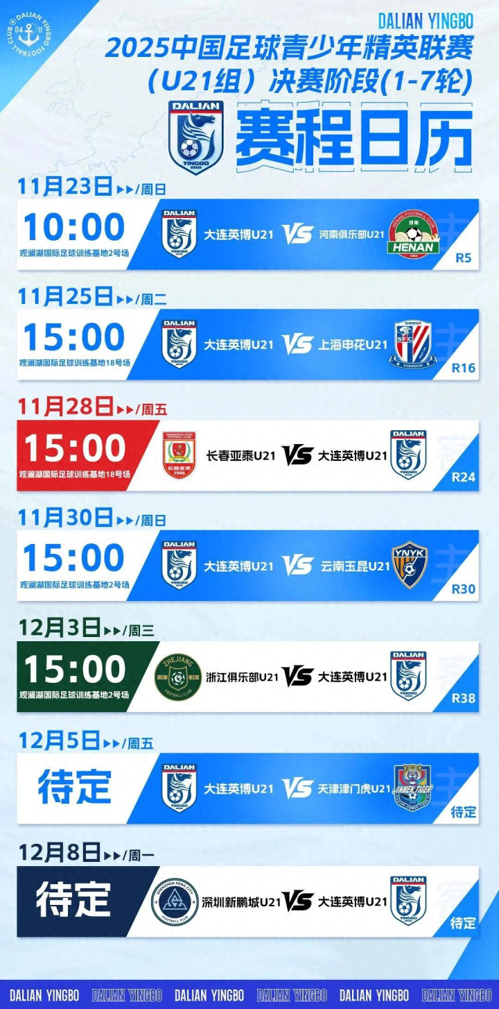 本场胜利,充分展现了大连英博U21队良好的战术执行与团队配合能力。同时,大连英博U21队凭借净胜球的优势位居积分榜首位。12月3日,大连英博U21队将于观澜湖国际足球训练基地2号场迎战浙江俱乐部U21队。期待年轻小将们延续出色状态,在未来的比赛中再创佳绩!